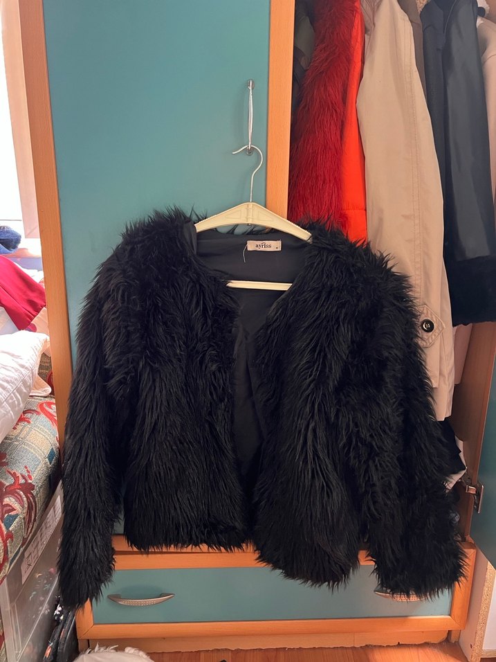 Fitted kesim, uzun kollu siyah sahte kürk ceket, rahat fleece kumaş ve gotik tarzı ile günlük kullanıma uygun.