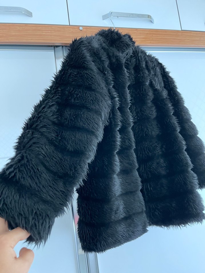 Kadınlar için siyah, kürk detaylı midi mont. Uzun kollu, yakası kesilmiş ve yumuşak sentetik kumaştan yapılmıştır. Rahat ve gotik tarzda, günlük kullanıma uygundur.