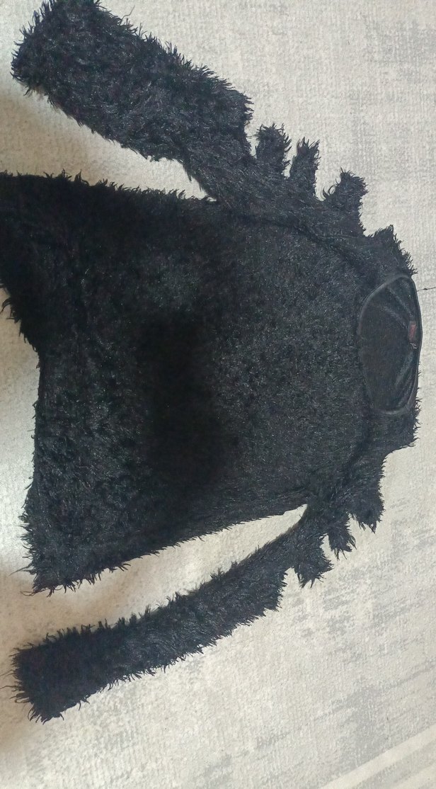 Kadınlar için siyah, uzun kollu ve yuvarlak yakalı, kürk detaylı, vücuda oturan triko. Yumuşak sentetik kumaştan, rahat ve gotik tarzda.