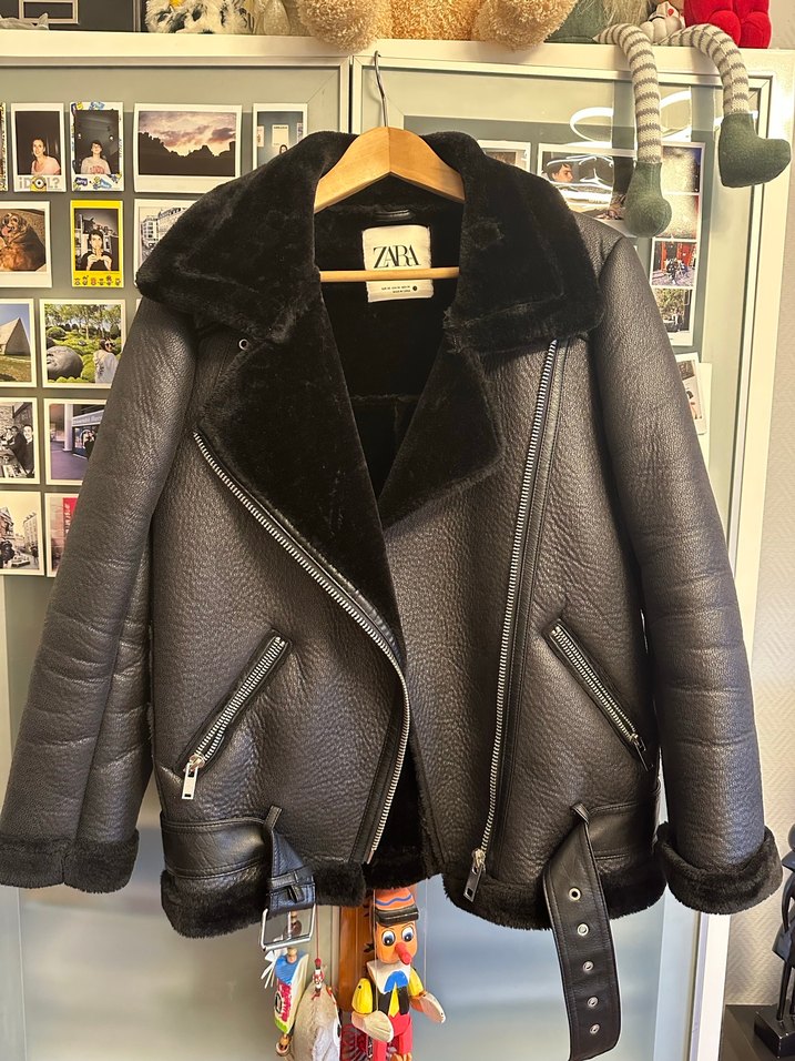 Zara marka, kürklü detaylı, siyah biker deri ceket. Notch yakalı, dar kesim ve günlük kullanıma uygun, rock punk tarzını yansıtır.