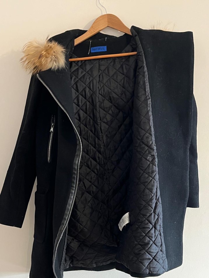 Kürk detaylı, yakalı siyah kışlık kaban. Orta boy, düzenli kesim ve kapitone astarıyla sıcak tutar. Sokak modasına uygun, rahat bir tasarım.