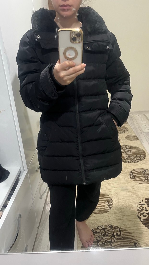 Siyah, kürklü detaylı, yüksek yakalı ve fitted kesim midi kışlık mont. Yumuşak ve sıcak kumaştan üretilmiştir, günlük kullanıma uygundur.