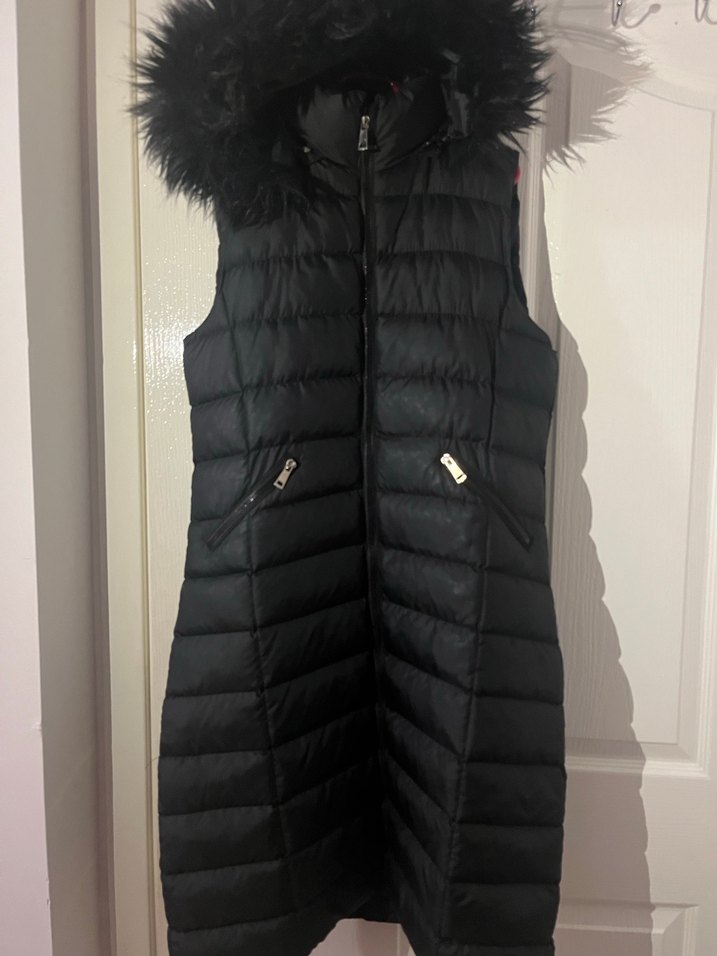 Yüksek yakalı, kürklü detaylı siyah, kolsuz, vücuda oturan midi yelek. Yumuşak sentetik kumaştan, gündelik kullanıma uygun rahat goth tarzı.