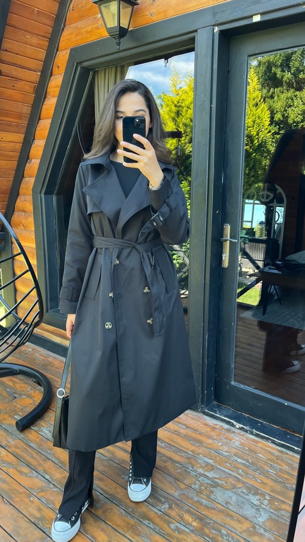 Kadın siyah trençkot, kuşaklı ve uzun kollu su geçirmez içten astarlı bedenlerimiz mevcuttur