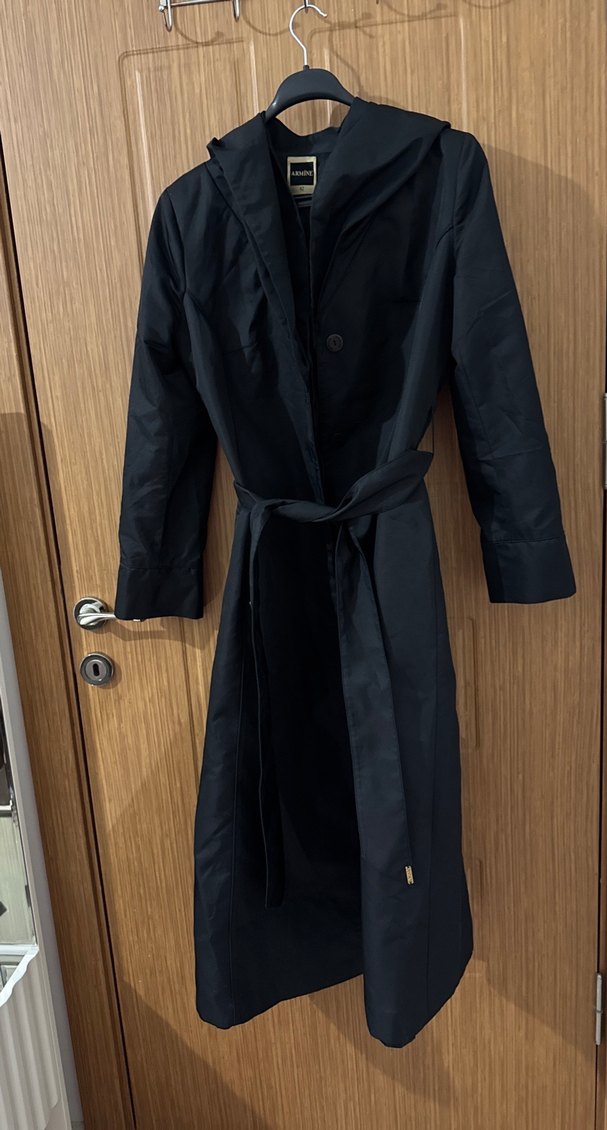Kadın siyah trençkot, kuşaklı ve klasik yaka detayına sahip. Uzun kollu, ipeksi kumaştan, ofis ve günlük kullanıma uygun şık bir model.
