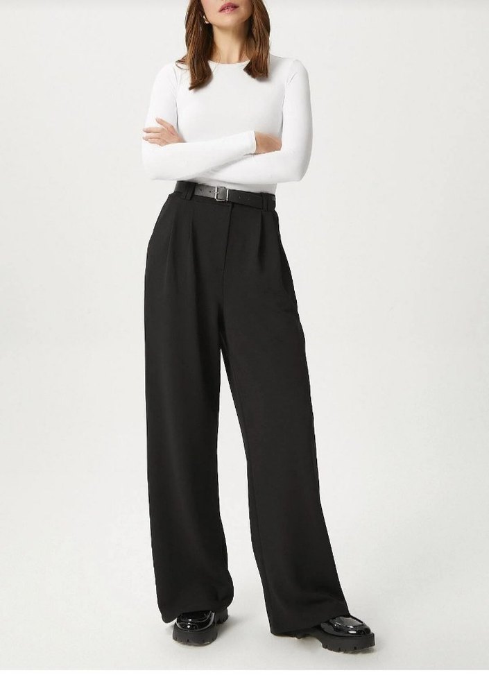 Kadınlar için siyah kumaş pantolon, normal kesim ve midi boyda, kemerli. Ofis için uygun, minimalist ve normcore tarzda, yumuşak sentetik kumaştan yapılmıştır.