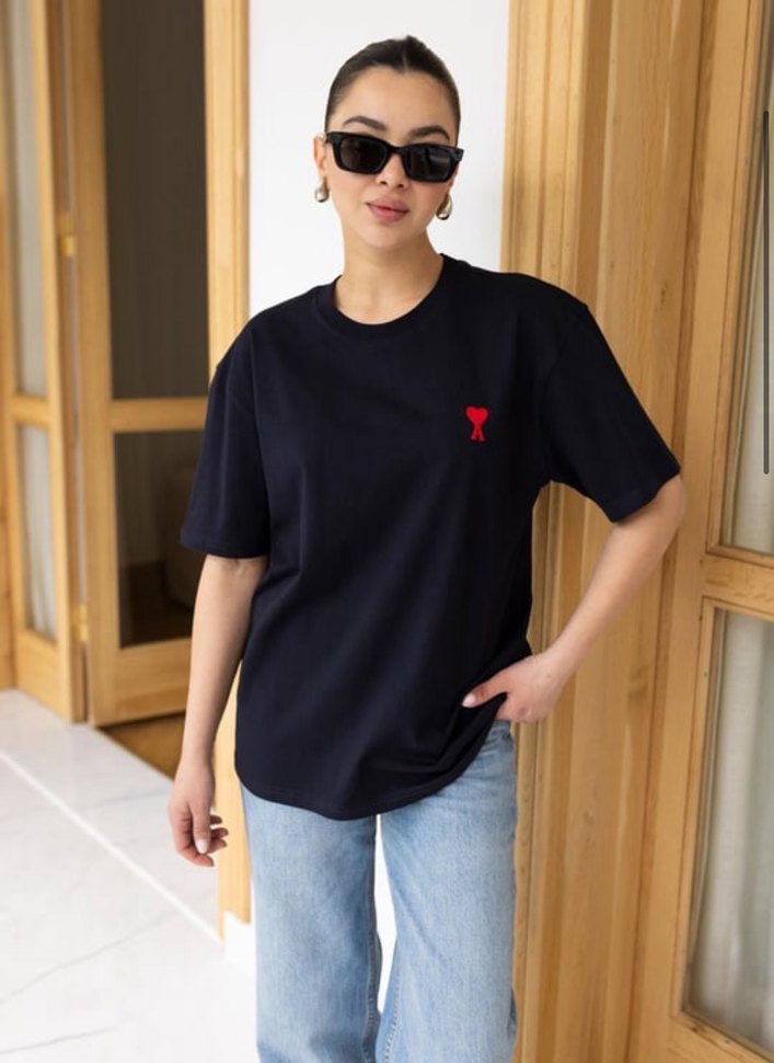 Beden mevcut Siyah, loose fit kadın tişörtü kısa kollu ve bisiklet yaka. Denim kumaştan, küçük kırmızı baskı detayıyla günlük kullanım için uygun.