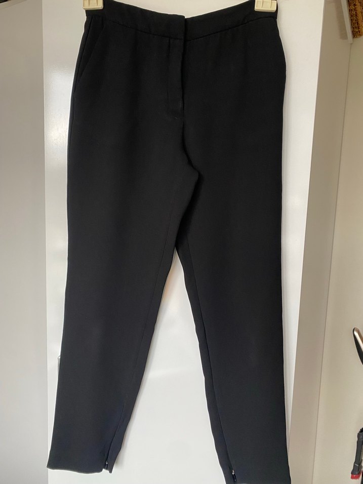 Siyah midi uzunlukta, regular fit kadın kumaş pantolon. Fermuarlı detayları ile minimalist ve normcore tarzda, ofis kullanımına uygun. Siyah kumaş pantolon cepli paçası fermuarlı bel 37, boyu 92 cm’dir
