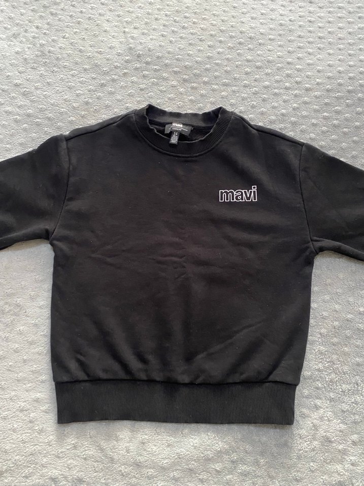 Kadın siyah sweatshirt, yuvarlak yaka ve uzun kollu, rahat kesimlidir. Yumuşak ve sıcak kumaştan üretilmiş, göğüste 'mavi' nakışı vardır. Günlük kullanım için uygundur.
