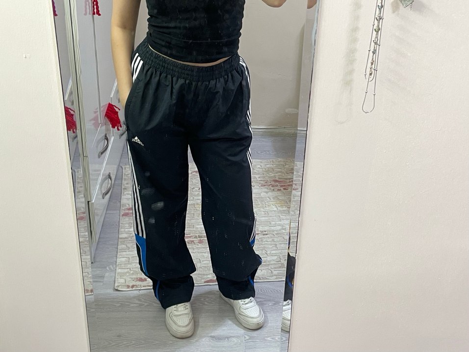 Kadınlar için siyah ve mavi tonlarında, rahat kesim, velcro detaylı, sentetik kumaştan spor ve sokak tarzına uygun eşofman altı. ♀️Boyum 162 kilom 54.Ürün eski Adidas ürünüdür orijinal