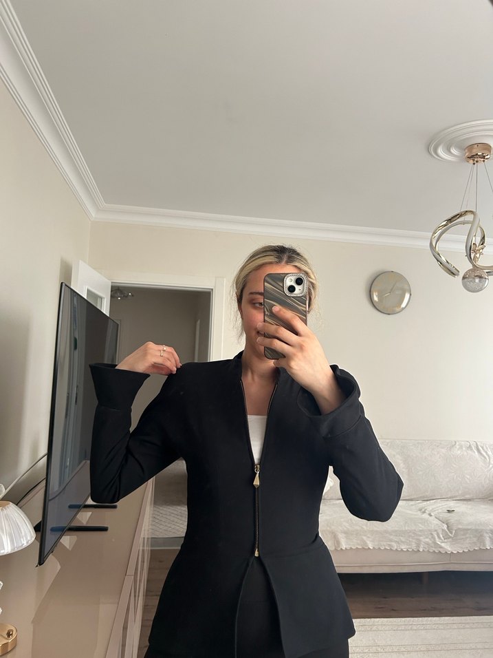 Kadın siyah midi blazer ceket, kesik yaka ve uzun kollu. Regular fit, sentetik kumaştan, ofis için şık ve rahat bir görünüm sunar.