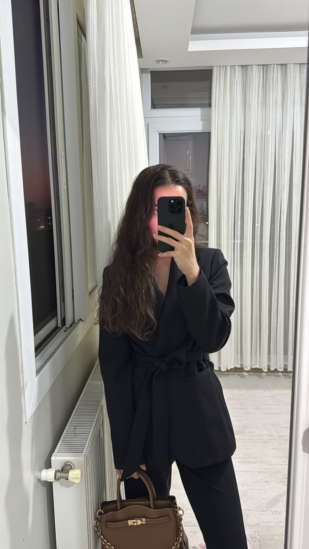 Kadınlar için normal kesim, midi boy, siyah blazer ceket. kumaştan, kesik yaka ve uzun kollu, ofis için şık ve rahat bir model.