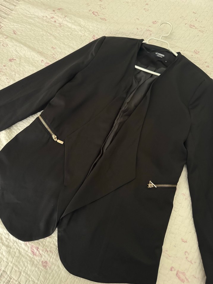 Kadın siyah blazer, kesik yaka ve fermuarlı ceplerle. Normal kesim, uzun kollu ve ipeksi dokulu, ofis ve günlük kullanım için uygun.