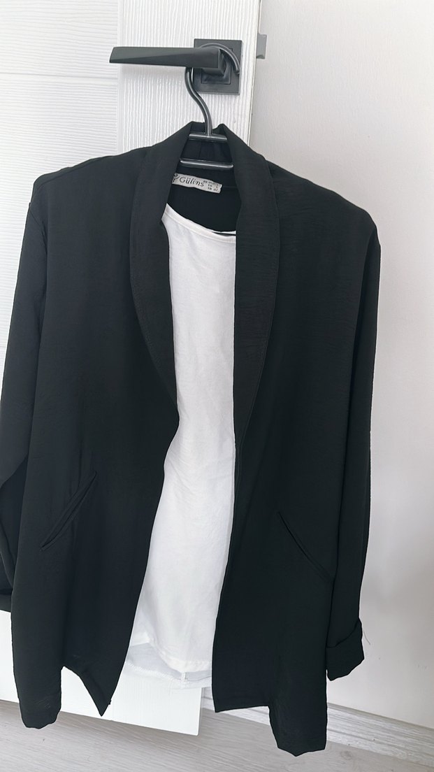 Kadın siyah blazer, notched lapel ve uzun kollu, ipeksi dokuda, regular fit ve midi boyda, ofis ve günlük kullanıma uygun. Takım