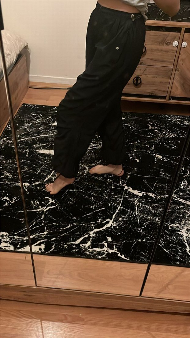 Siyah, midi boy, bol kesim ve kemerli bu kadın pantolonları, ipeksi kumaştan üretilmiştir. Günlük kullanım için uygun, sokak modası ve avangard tarzı yansıtır.