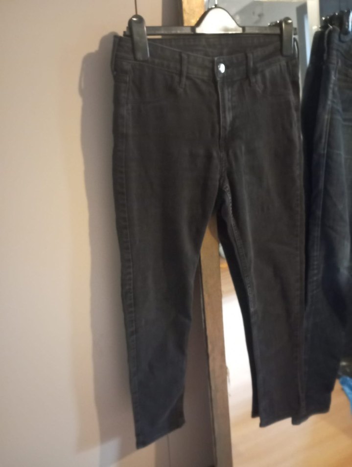 Kadın siyah, midi boy, dar kesim denim pantolon, tokalı detaylı, günlük sokak stili için uygun.