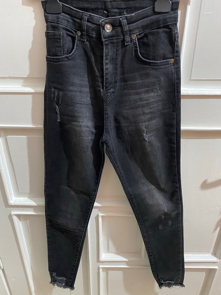 Tokalı, yıpratma detaylı siyah denim kot pantolon. Midi boy ve dar kesim, günlük kullanıma uygun.36-34 olur
