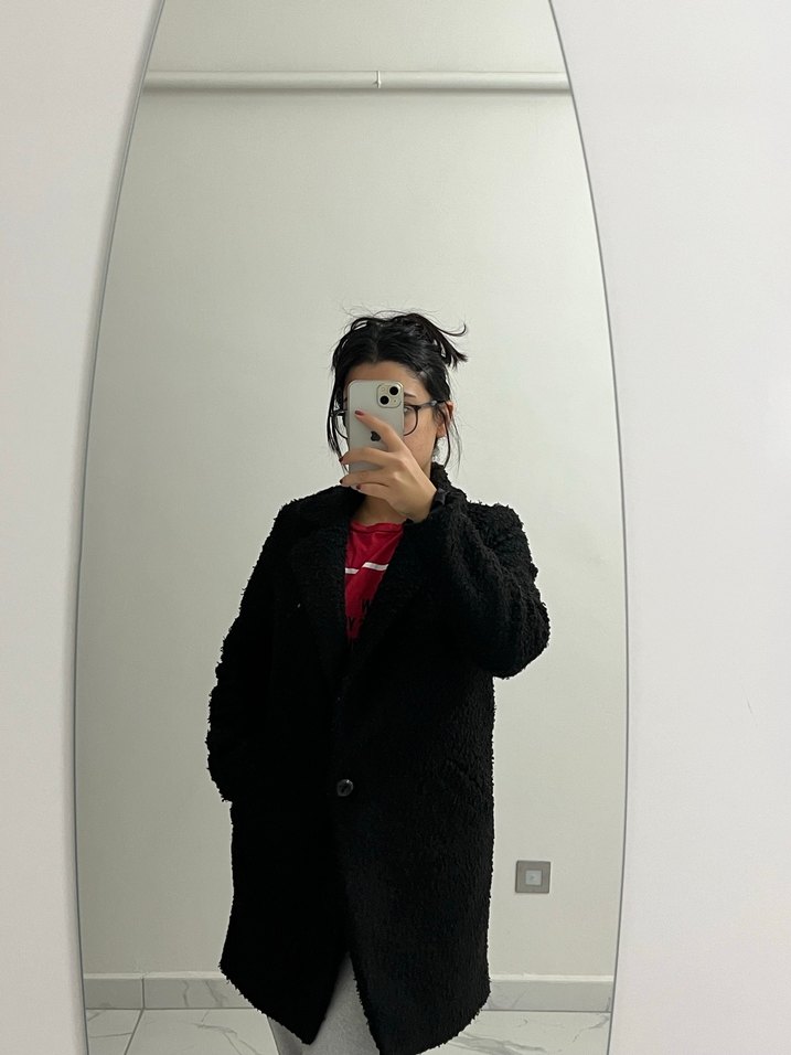 Kadınlar için siyah midi boy, kürklü detaylı, uzun kollu, yumuşak ve sıcak kumaştan bol kesim kaban. Günlük kullanım için uygundur.