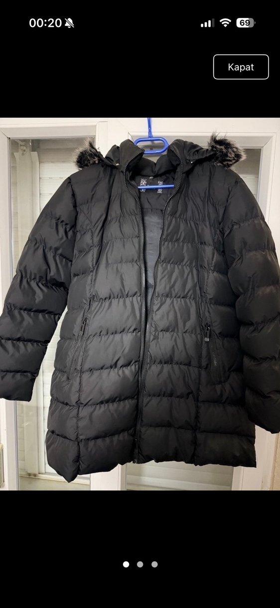 Fitted kesim siyah kışlık mont, kapüşonunda kürk detaylıdır. Uzun kollu, midi boy ve yumuşak sentetik kumaştan yapılmıştır, rahat sokak stili için uygundur. ❄️