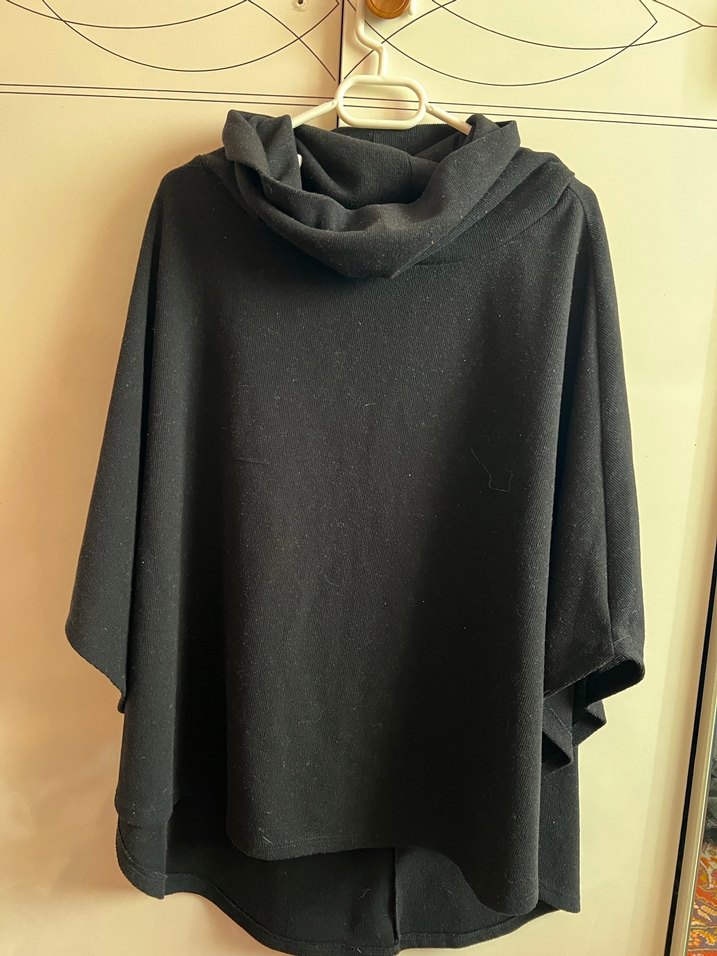 Siyah midi boy, uzun kollu, yüksek yakalı, bol kesim panço. Yumuşak ve sıcak kumaştan, rahat ve gotik tarzda günlük kullanım için uygundur.