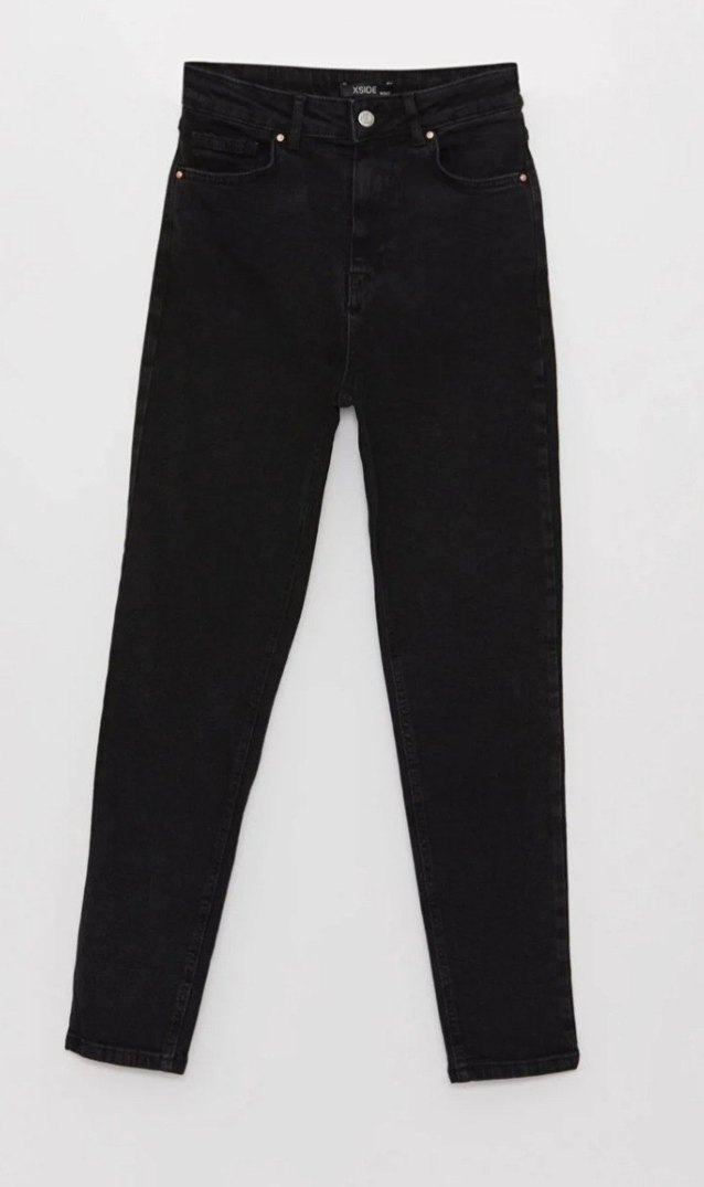 Kadınlar için regular fit siyah denim pantolon, midi boy ve tokalı detaylı, günlük rahat sokak stili için uygundur.