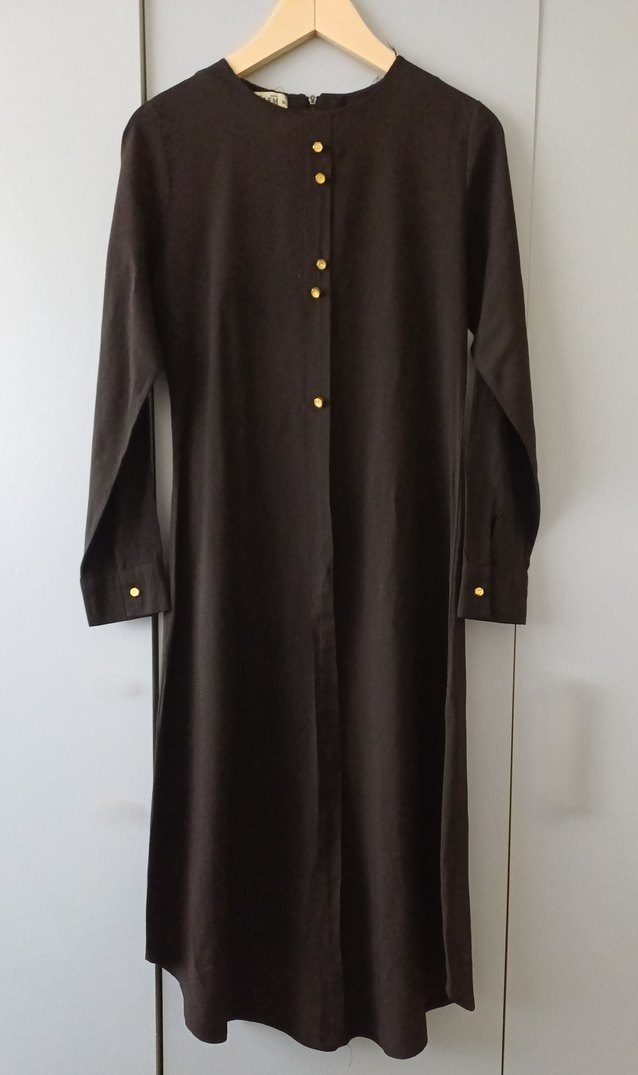Kadın siyah midi boy tunik, önü düğme detaylı, arkası bele kadar fermuarlı ve uzun kolludur. %100 viskonkumaştan yapılmış, 118 cm ,minimalist ve gotik tarzda, ofis ve günlük kullanım için uygundur.