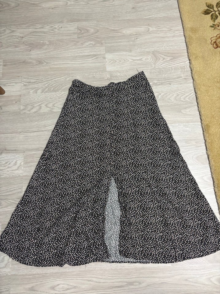 Siyah midi etek, salaş kesim ve fırfır detaylarıyla, yumuşak sentetik kumaştan üretilmiştir. Minimalist sokak tarzıyla günlük dış mekan kullanımı için uygundur.