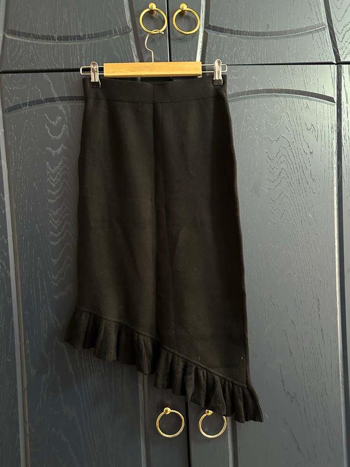 Siyah, vücuda oturan midi etek, yumuşak ve sıcak kumaştan, volan detaylı, gotik ve avangart tarzda. Günlük kullanıma uygun.