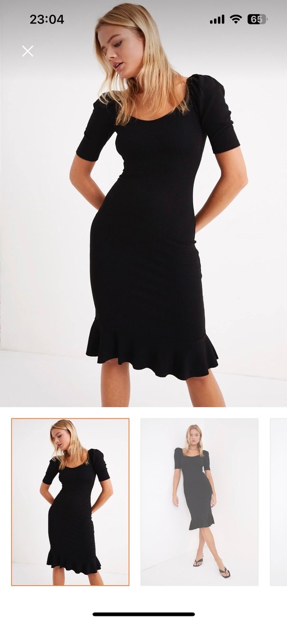 Siyah midi boy, kısa kollu, fitilli kumaştan yapılmış dar kesim elbise. Etek kısmında fırfır detayı bulunur,