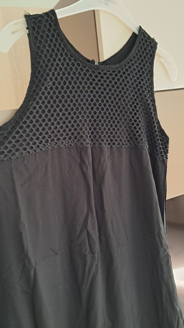 Siyah, kolsuz midi elbise, yüksek yakalı ve drapeli, bol kesim üst kısmı dokulu tasarıma sahiptir, goth tarzı için uygundur.