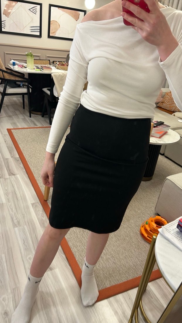 Kadınlar için siyah midi kalem etek, düz sentetik kumaştan, ofis için şık ve rahat bir görünüm sunar. Sade tasarımıyla zahmetsiz şıklık sağlar.