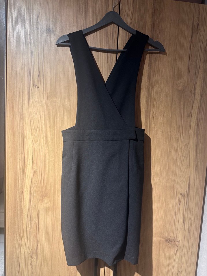 Siyah midi uzunluğunda, kemerli ve askılı tulum. Notlu yaka ve düz dokulu, ofis için uygun rahat kesim.