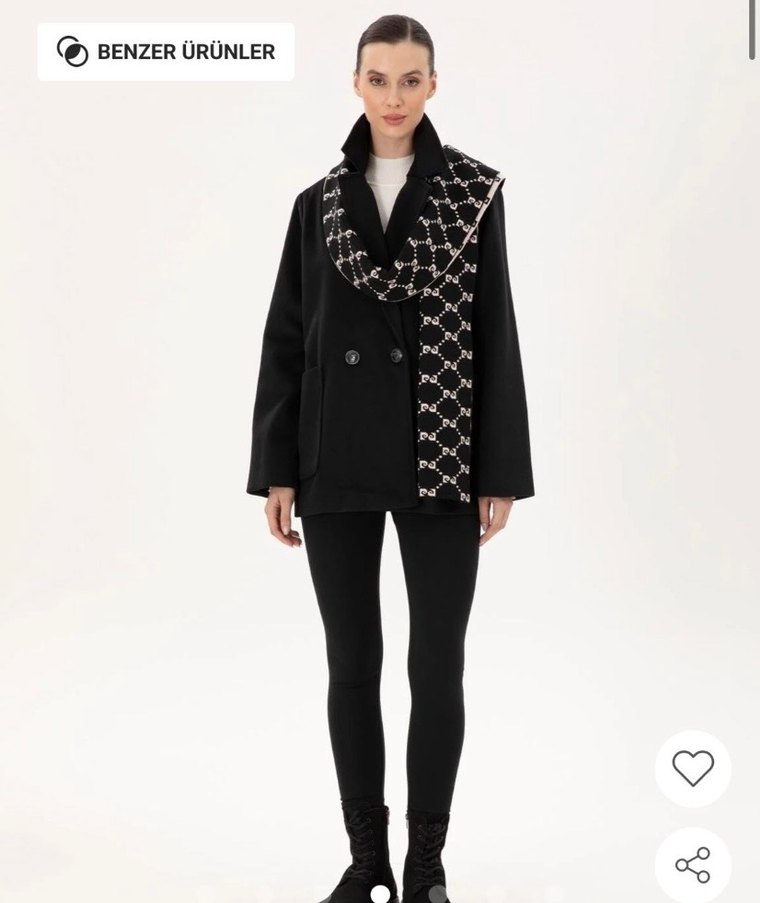 Siyah midi uzunlukta, notlu yaka ve uzun kollu kadın kabanı. Kemer detaylı, ofis kullanımı için uygun, desenli eşarp detayı bulunur.