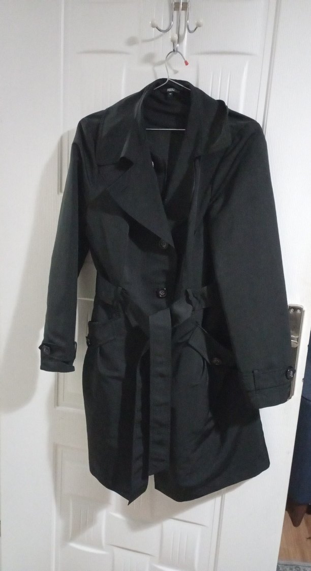 Siyah midi uzunlukta, kemerli ve kesik yakalı trençkot. Strappy kollu, düz desensiz ve ofis kullanımı için uygun, goth tarzında.