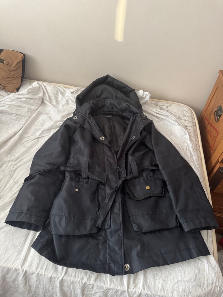 Kadınlar için tasarlanmış bu siyah ceket, kemerli ve uzun kolludur. Sentetik kumaştan üretilmiş olup rahat ve bol kesimdir, sokak modasına uygundur. Fotolarda görüldüğü gibidir