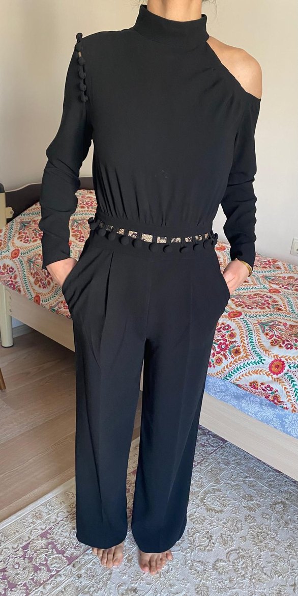 Siyah midi uzunlukta, kemerli, yüksek yakalı ve askılı kollu kadın tulumu. Ofis için uygun, rahat kesim ve sentetik kumaştan.