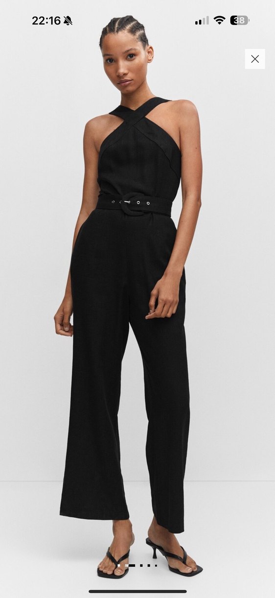 Kadınlar için siyah midi uzunlukta, kemerli, yüksek yakalı ve askılı kollu, ipeksi dokulu tulum. Ofis ortamı için uygun, rahat kesim.