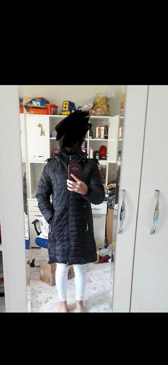 Kadınlar için siyah, diz boyu, yüksek yakalı ve fermuarlı kış montu. Yumuşak ve sıcak kumaştan, günlük rahat sokak giyimi için uygundur.