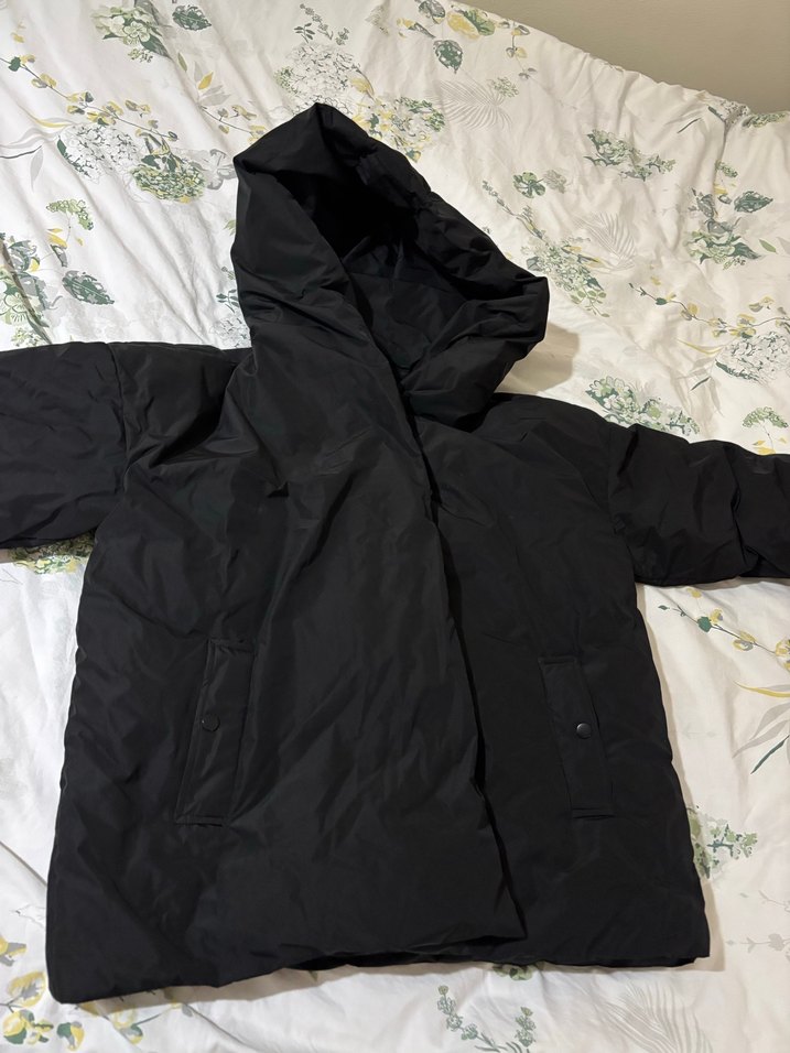 Bu siyah kışlık mont yüksek yakalı, drapeli ve bol kesimdir. Uzun kollu, midi boyda olup dış mekan kullanımı için uygundur. Yumuşak kumaşıyla sıcak tutar.