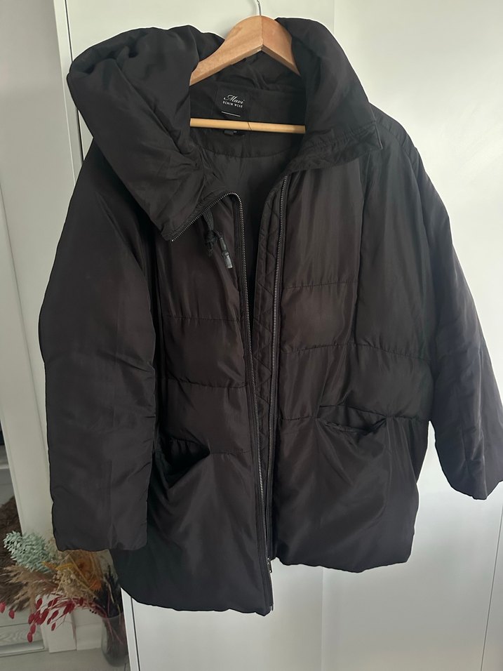 Kadınlar için koyu siyah, uzun kollu, fermuarlı ve notlu yaka detaylı, bol kesim midi kışlık mont. Sıcak tutan yumuşak kumaştan üretilmiştir.