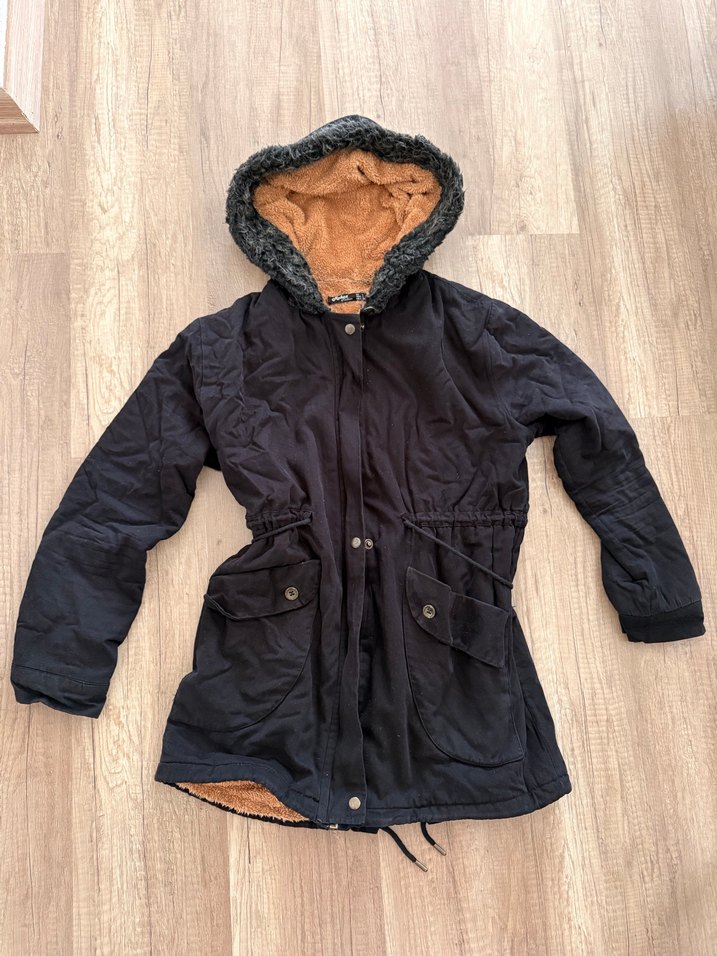 Kadın siyah kışlık mont, bol kesim ve kürklü kapüşon ile notched yaka detayına sahiptir. Uzun kollu ve sıcak tutan fleece astarlıdır, dış mekan kullanımı için uygundur. ❄️