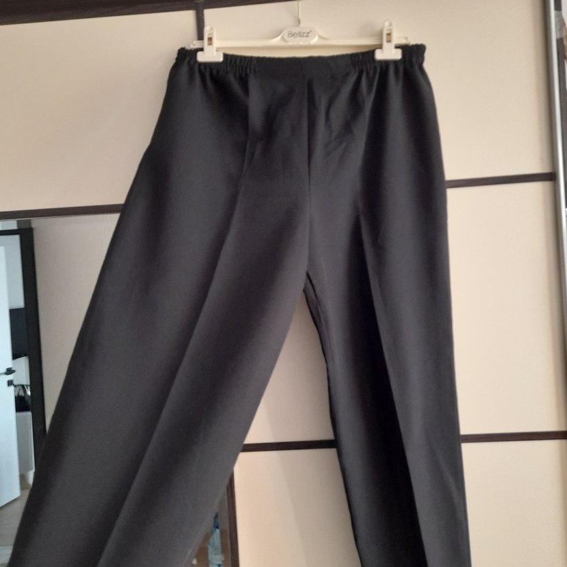 Siyah midi uzunlukta, düz kesim ve lastikli beliyle sade, ofis kullanımı için uygun kumaş pantolon.