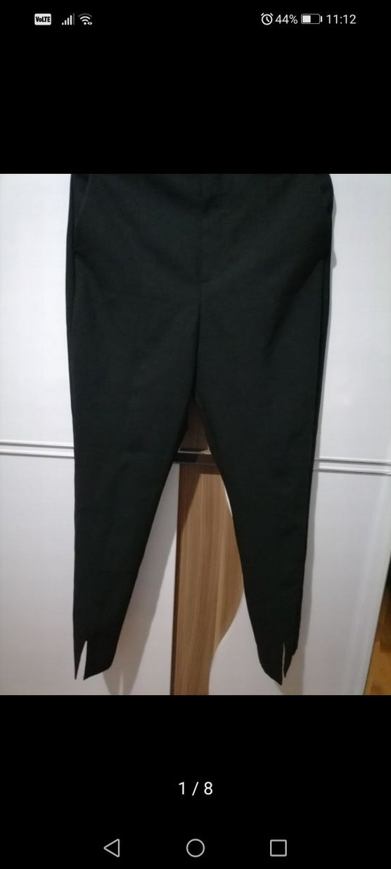 Kadınlar için siyah, sentetik kumaştan yapılmış, normal kesim ve midi boyda, paçalarda yırtmaçlı pantolon. Ofis ve günlük sokak stili için uygun. Sıfır ürün, kullanılmamış beden küçük geldi için. Mağazadan yeni alınmış gibi sadece etiket kayboldu. Duruşu, kalitesi L - 40 beden. Yırtmaçlı paçalar, yüksek bel. Tüm detaylar fotoğraflara var. Işıklardan dolayı fotoğraflar değişiklik gösterebilir.
