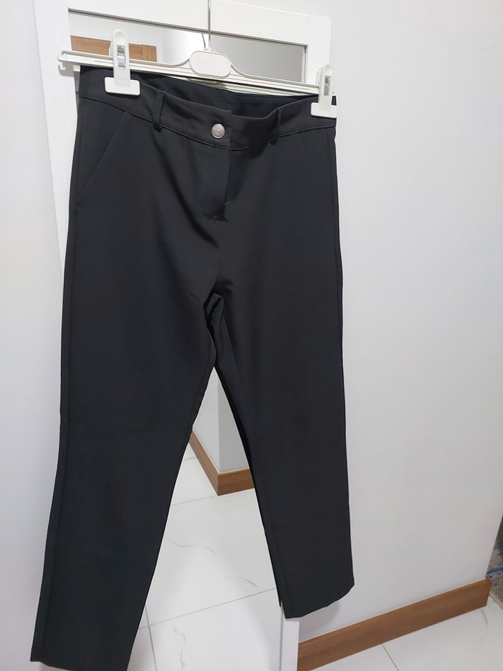Kadınlar için siyah midi boy kumaş pantolon, regular fit ve kemerli bel detayına sahiptir. Sentetik kumaştan üretilmiş, ofis ve günlük sokak stiline uygundur.