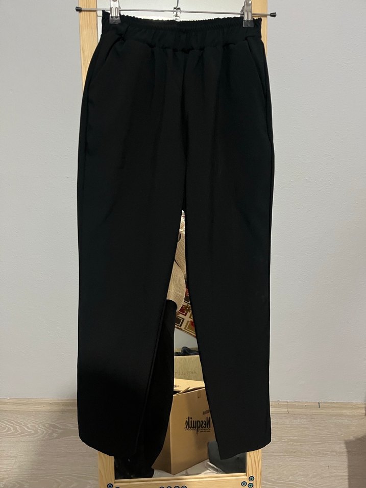 Kadınlar için normal kesim ve midi boyda, ipeksi dokulu siyah kumaş pantolon. Ofis için uygun, rahat ve şık bir tarz sunar. Cepli ve lastikli bel genişliği 64cm M beden boy uzunluğu 90cm