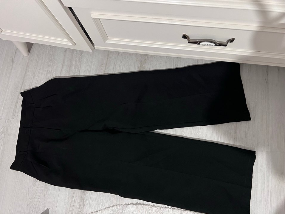 Kadın siyah kumaş pantolon, normal boy ve regular fit kesime sahiptir. Yanlarda yırtmaç detayı bulunur, ofis için uygundur.