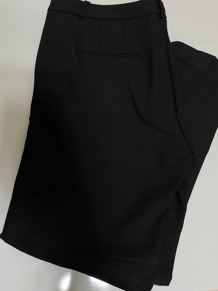 Siyah midi uzunlukta, kadın kumaş pantolon, normal kesim ve ipeksi dokuyla ofis için uygun, sade ve şık tarzda.