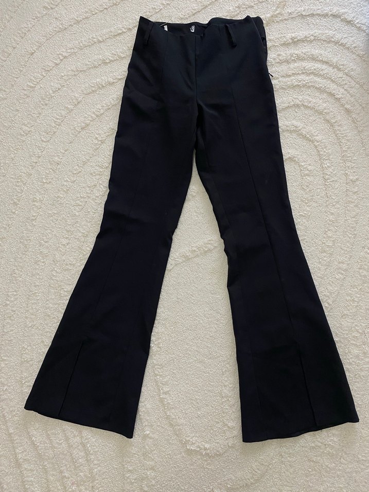 Kadın siyah midi pantolon, yumuşak ve sıcak kumaş ile kürk detaylı, minimalist ve trend günlük tarz için uygundur. Paçaları kesikli kumaş pantolon