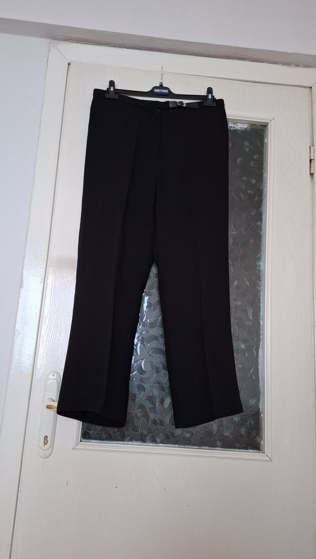 Saten dokulu, regular fit siyah midi uzunlukta kadın kumaş pantolon. Tokalı detaylarıyla ofis için uygun, trend casual stilinde.Bel44 boy 99 paça genişliği 26,5 cm.