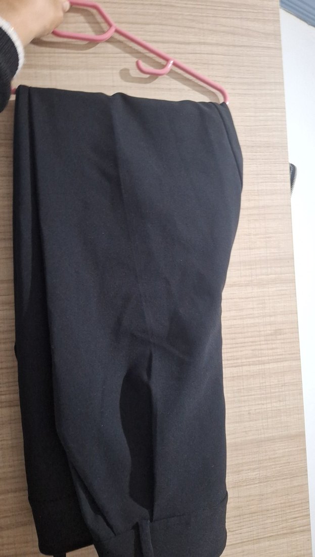 Kadınlar için siyah kumaş pantolon, normal kesim ve midi boyda, yırtmaçlı detaylıdır. Ofis kullanımı için uygundur ve düz, sade bir tarza sahiptir.